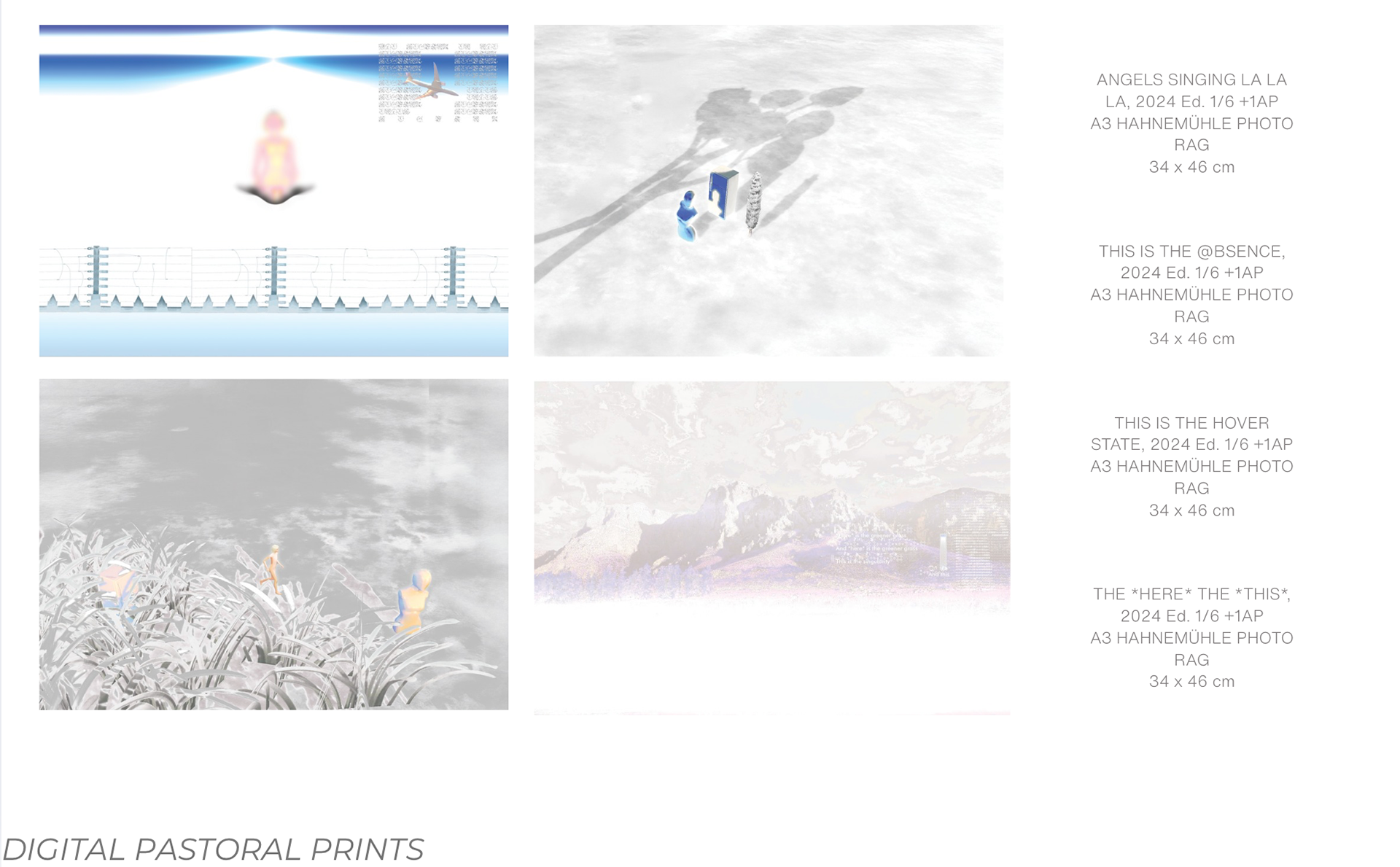 In this series of prints, Ruby Bailey constructs quiet, imagined landscapes through a process of layering, recomposition, and atmospheric refinement. Starting from photographs of the natural world, she reworks the images by softening colour, introducing symbolic elements, and integrating visual fragments drawn from both personal life and the broader visual culture of the present moment.