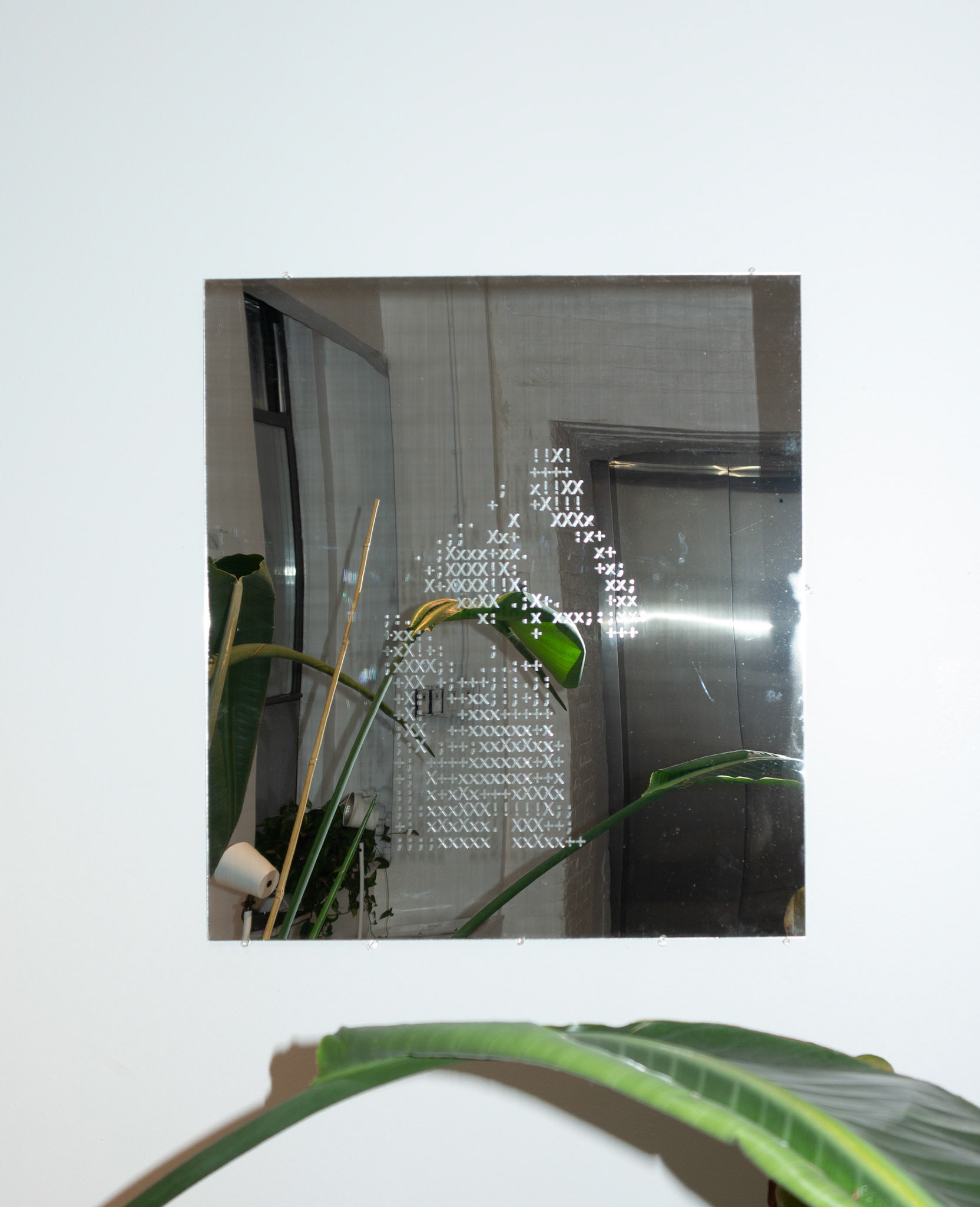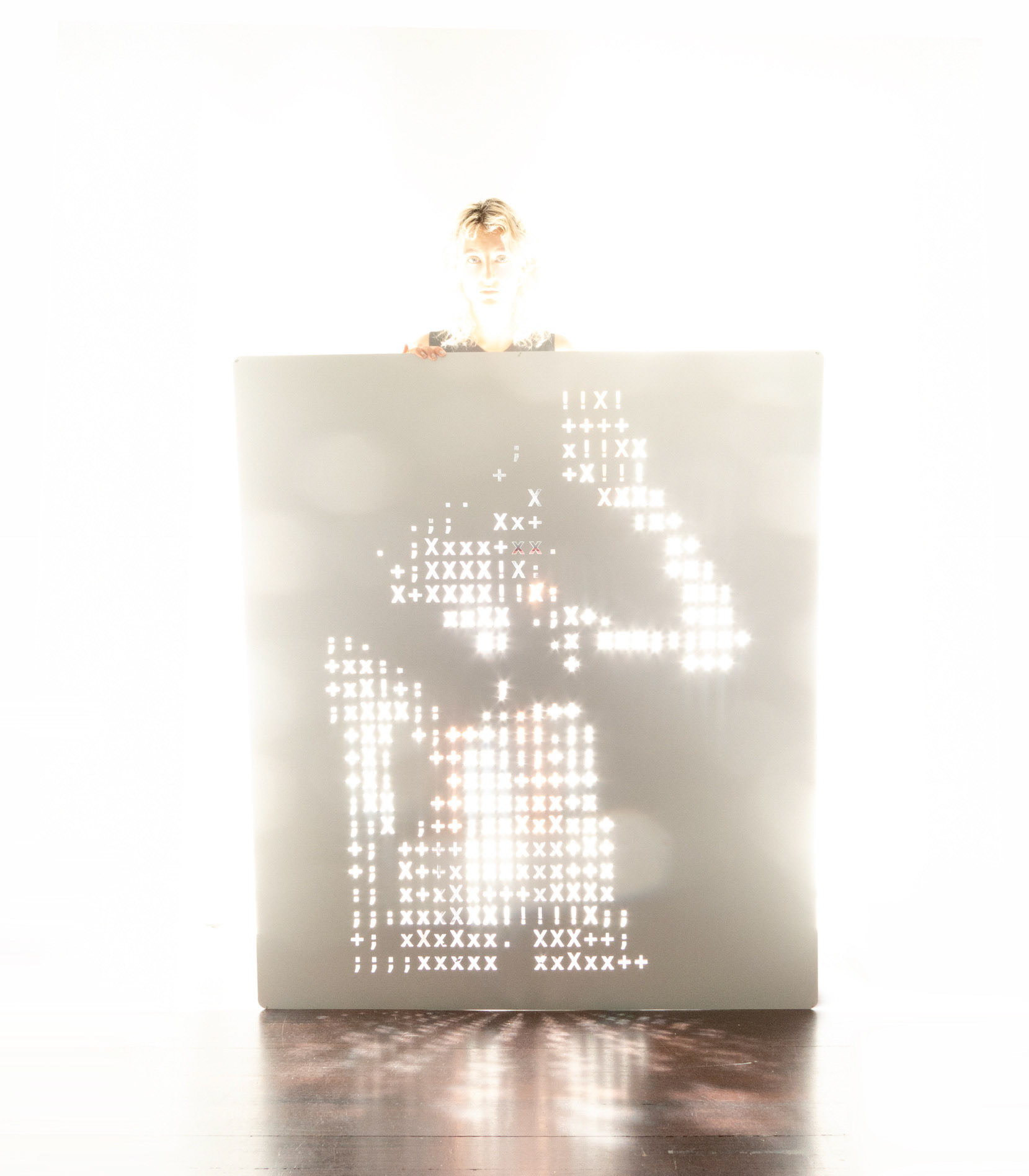 The resulting images occupy a strange threshold, hidden in plain sight. The coded forms are then rendered physically through various processes: laser-engraved into wood or acrylic, printed on paper, or cut directly from metal panels. Each material carries its own weight and readability, from the sharpness of laser-cut steel to the softness of ink on paper.