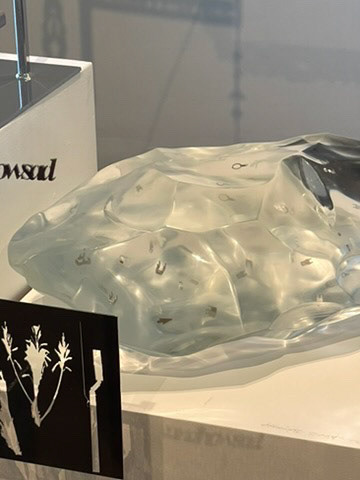 3D SCANNED ACHEULEAN HANDAXE, SCALED TO 60CM, CAST IN CLEAR RESIN WITH MISCELLANEOUS ELECTRONIC COMPONENTS SUSPENDED WITHIN