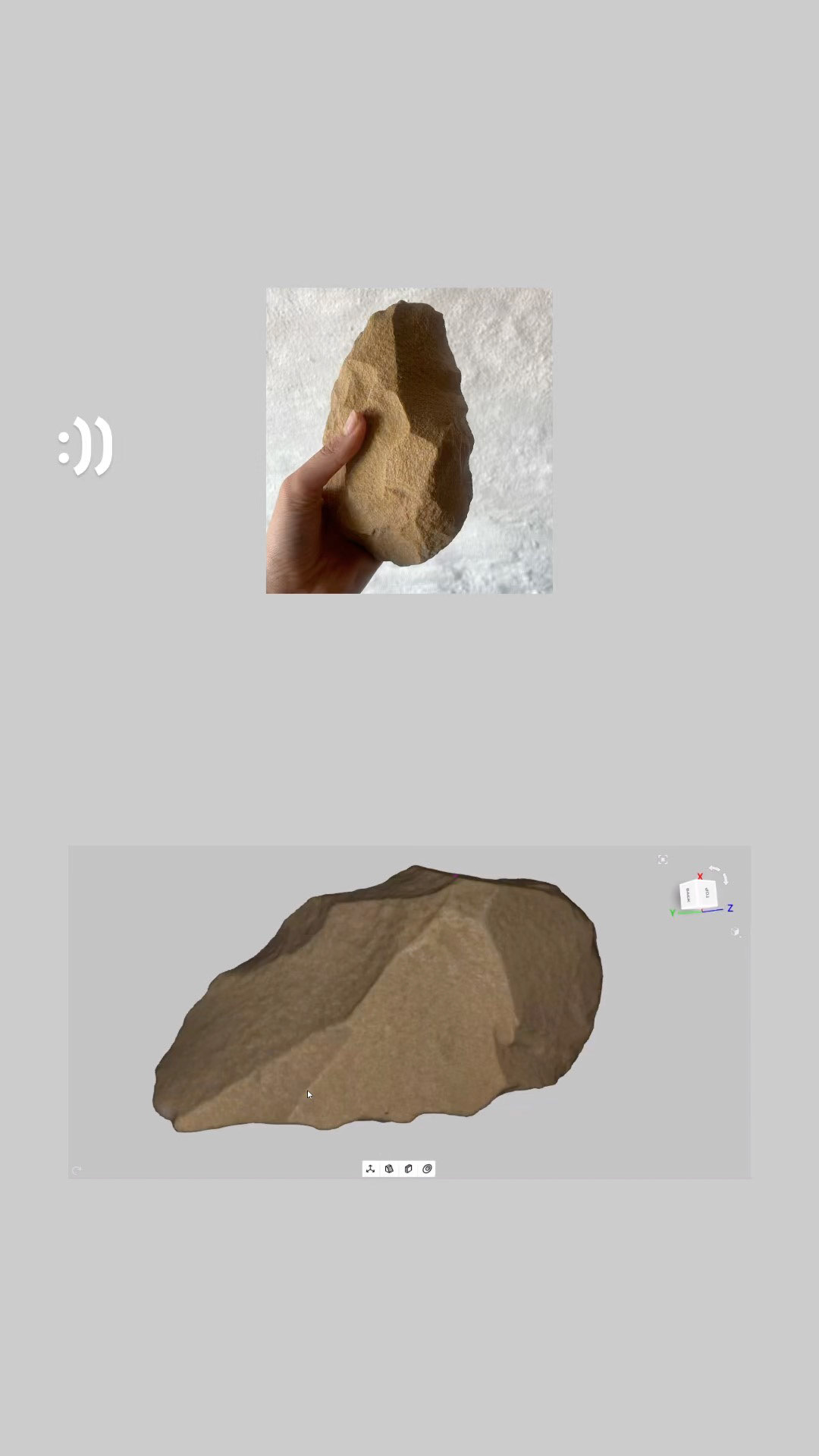 By recontextualising the stone tool within this speculative terrain, SOLID AIR positions itself as a monument to human perception and technological continuity. It feels geological, ritualistic, and yet hyper-contemporary, an object that could belong in a museum, a ruin, or a science fiction archive.