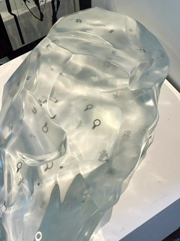 Stone Tool: *Solid Air* is a resin-cast sculpture based on an Acheulean-era hand axe, one of the earliest known examples of human tool-making. Scaled up, 3D-scanned, and embedded with cybernetic fragments and metallic components, the work is presented as an artefact from the speculative world of Ethereality, a digital pastoral where time collapses, and history is both remembered and reimagined.